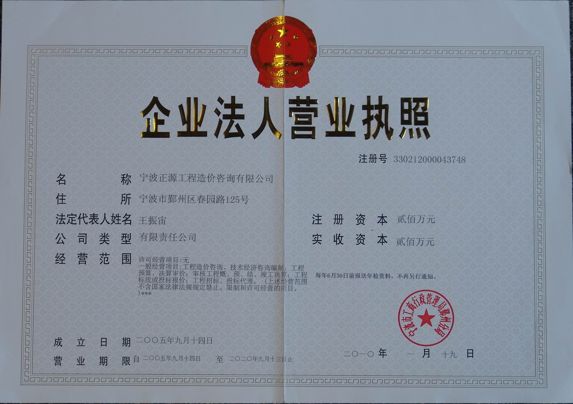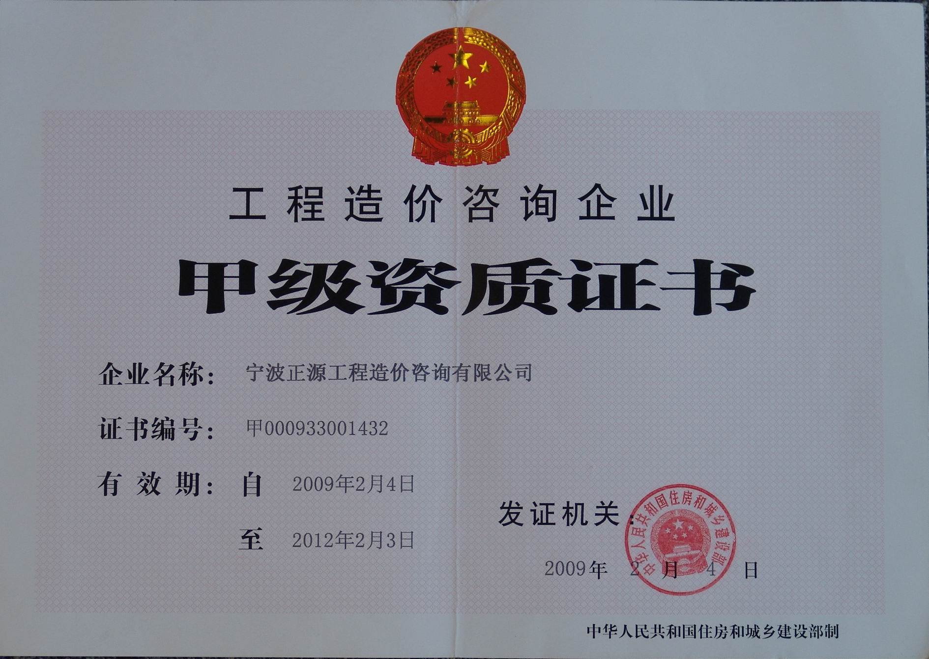 企業法人營業執照 工程造價咨詢企業甲級資質證書